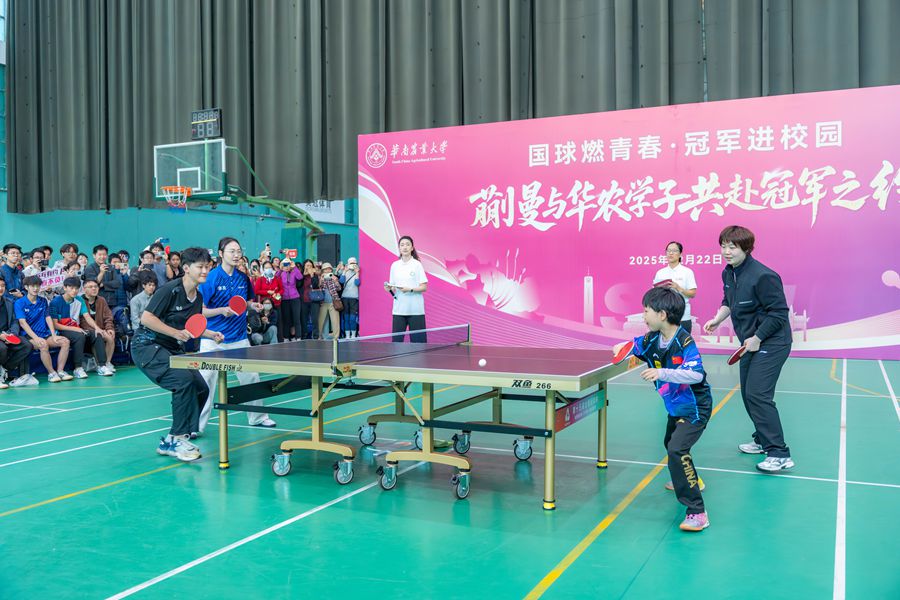 为深化全国健康学校建设,推进立德树人机制综合改革,12月22日,“国球燃青春·冠军进校园”主题活动在华南农业大学举办。中国女子乒乓球运动员、世界冠军蒯曼走进华农校园,与师生分享成长故事、切磋球技、亲切互动,并受聘为华农体教融合特约辅导员、乒乓球队名誉教练。