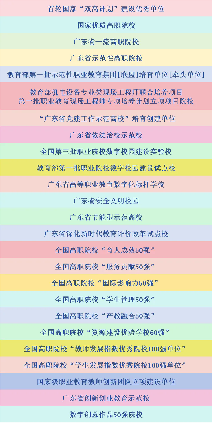 延续60年悠久学脉:全日制公办高职院校,深耕职业教育60年,首轮国家“双高计划”建设优秀单位、国家优质高职院校、广东省示范性高职院校、广东省安全文明校园。