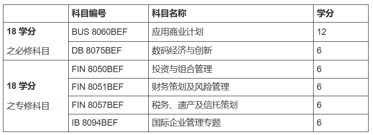 循「途径一」入学的学生必须修毕24学分,其中包括12学分的BUS 8060BEF应用商业计划以及12学分的专修科目。