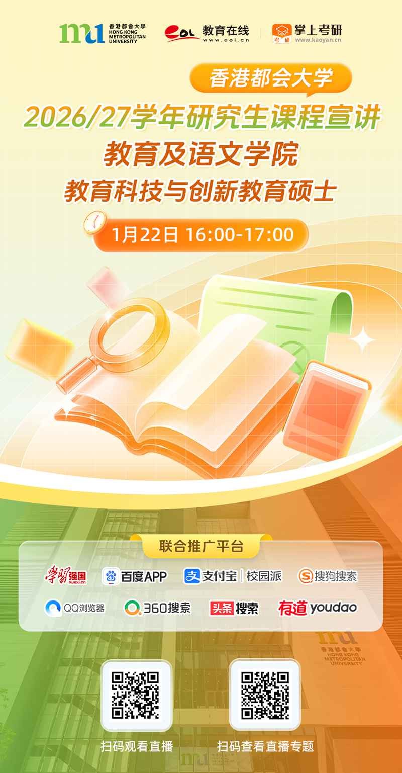 直播预告|1月22日,香港都会大学2026/27学年研究生课程宣讲——教育及语文学院