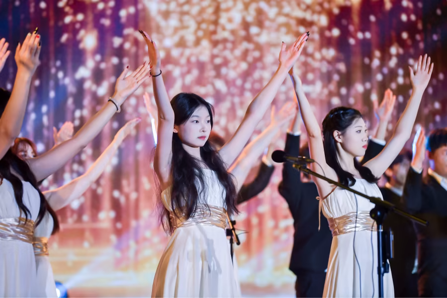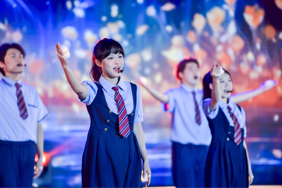 作为本届艺术节的华彩乐章,主题曲《湾区艺起来》在展演尾声呈现,将全场气氛推向高潮。歌曲由粤港澳三地学生代表联袂献唱,巧妙融合粤语、国语与戏曲念白,旋律植根经典广东音乐《彩云追月》,又洋溢着现代青春的澎湃活力。它以音乐为纽带,生动诠释了“地域相近、文脉相亲、艺脉相连”的湾区内涵,唱响了湾区青年“艺路同行”的坚定和声。