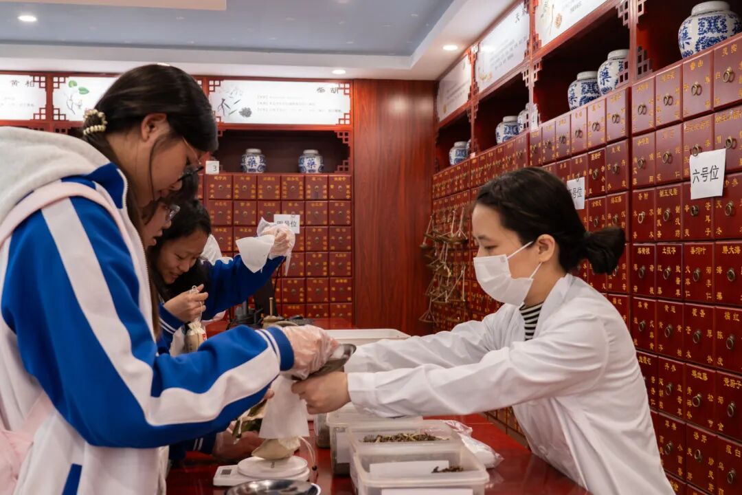 ▲在药学楼中药标本馆,同学们辨认草药、感知本草魅力,领悟中医药文化的博大精深