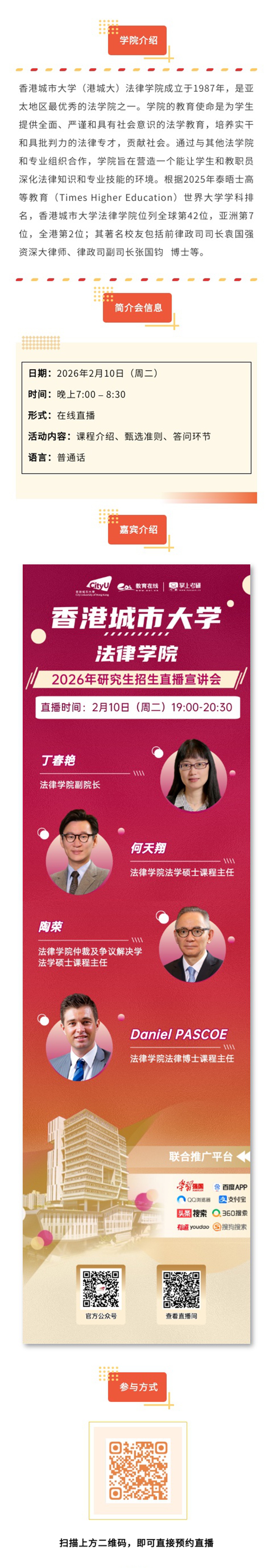 香港城市大学法学院硕士课程线上宣讲会,共研法律与国际的前沿视野!