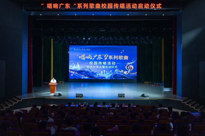 岭南三月,春意盎然,珠江之畔,乐韵悠扬。为落实学校以美育人、以文化育人的理念,传承岭南文化根脉,以音乐为纽带讲好广东故事、涵养青年学子家国情怀,3月20日,华南农业大学珠江学院举办“唱响广东”系列歌曲校园传唱活动创作分享会暨启动仪式。系列歌曲创作团队代表任钢、杨丹开展创作分享会,华珠副校长马雷猛、各二级学院党总支(副)书记,相关单位负责人以及学院师生代表共同参与活动,活动由校团委书记陈欣杰主持。