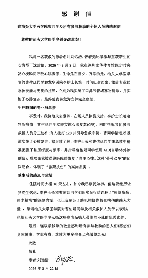 刘先生康复后,第一时间致电汕头大学党委宣传统战部,讲述了被曹佑廷施救的经历,表达对学校培育优秀学子的诚挚感谢。党委宣传统战部接到电话后,迅速开展相关工作,深入了解施救细节与曹佑廷的成长经历。同时,刘先生还亲手写下感谢信,向曹佑廷、李艳凤及所有参与救助的人员表达重获新生的感恩之情。