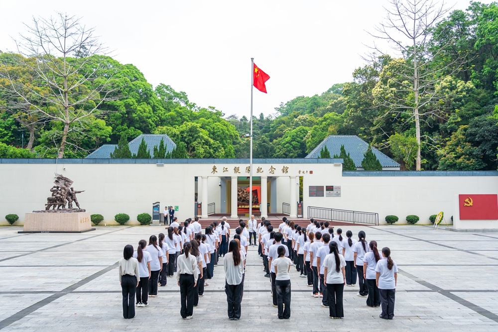 “在岭南的版图上,有一把锋利的宝剑,它刺破了旧时代的黑暗……”全体人员齐声诵读红色诗歌《英雄剑——写给东江纵队》。铿锵的诗句在纪念馆前回荡,寄托着新时代青年对革命先烈的无限追思和崇高敬意。随后,全体人员肃立默哀,师生代表依次上前敬献鲜花,表达对英烈的深切缅怀。