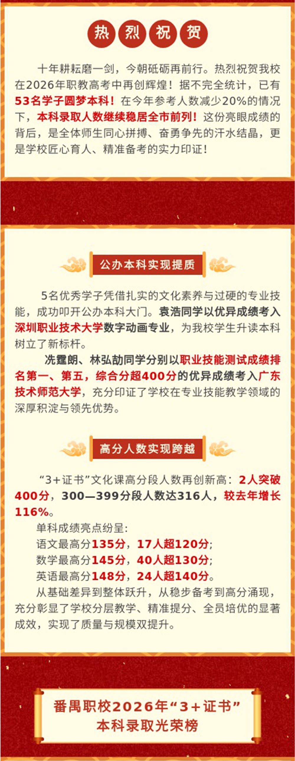 喜报!全市前茅,公办本科再突破!番禺职校2026年职教高考续写辉煌