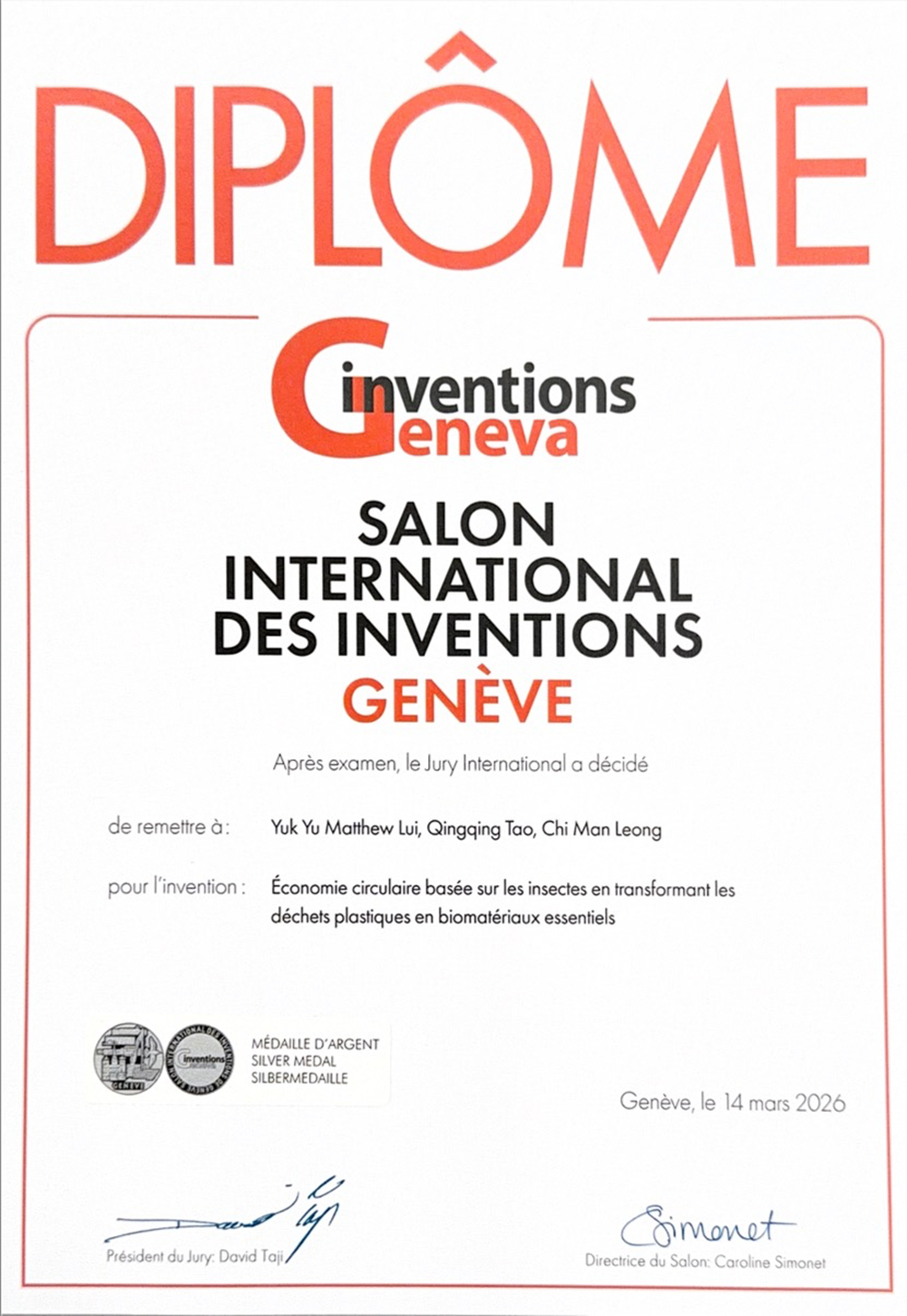 这项让塑料与有机垃圾“变废为宝”的创新技术,接连获得国际权威认可。2026年3月,在第51届日内瓦国际发明展上,团队凭借“基于昆虫的循环经济:将塑料废弃物转化为关键生物材料”项目斩获银奖。本次盛会共有来自35个国家和地区的1000多个发明项目参展。