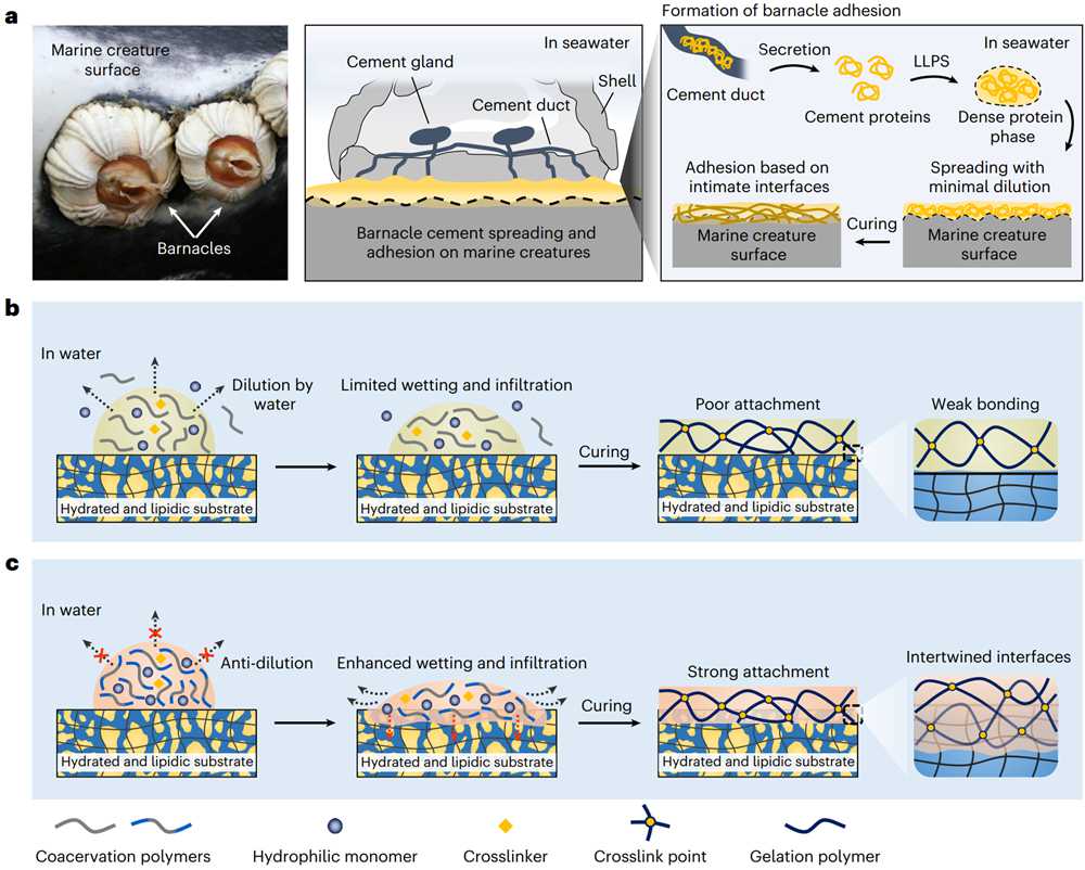 水下或潮湿环境中的牢固粘附是材料科学领域的长期挑战与难题。传统粘合剂易受水合层阻碍或被水溶胀,尤其在含水量高的水凝胶、脂质生物组织等基底上表现不佳。研究团队从藤壶的天然粘附机制中获得灵感——藤壶通过分泌蛋白质形成液-液相分离的凝聚体,实现水下高强度粘附。