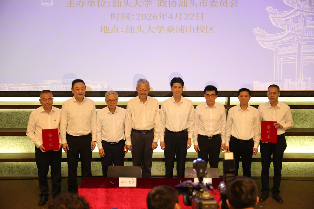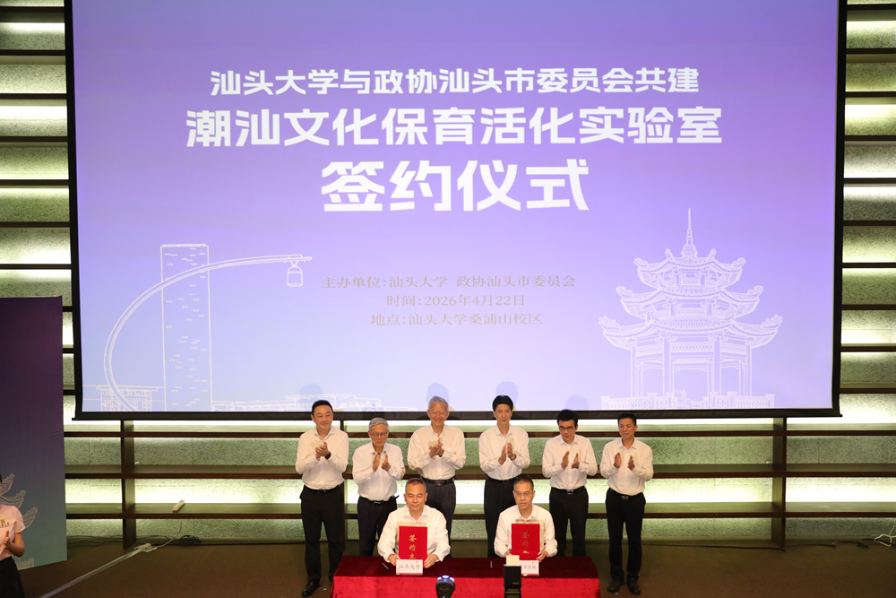 2026年4月22日下午,汕头大学与汕头市政协在桑浦山校区图书馆报告厅举行签约仪式,正式共建潮汕文化保育活化实验室。汕头市委书记温湛滨,汕头市政协主席邱奕辉,汕头大学党委书记唐锐,汕头市副市长彭聪恩,汕头大学党委常委、副校长、医学院党委书记胡忠,著名学者陈春声教授、林伦伦教授出席仪式。仪式由汕头大学党委常委、宣传统战部长杜式敏主持。