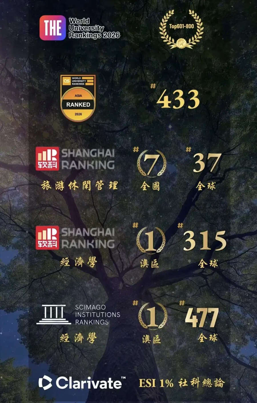 社會科學總論進入ESI全球前1%?旅遊業管理專業的博士、碩士、學士學位課程為均獲聯合國世界旅遊組織(UNWTO)TedQual優質教育素質認證