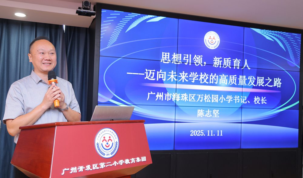广州市海珠区万松园小学党委书记、校长陈志坚分享的《思想引领,新质育人——迈向未来学校的高质量发展之路》让与会校长深知美好未来离不开“从昨天的事中吸取养分,在今天的事中进行磨练,为明天的事做好打算”。