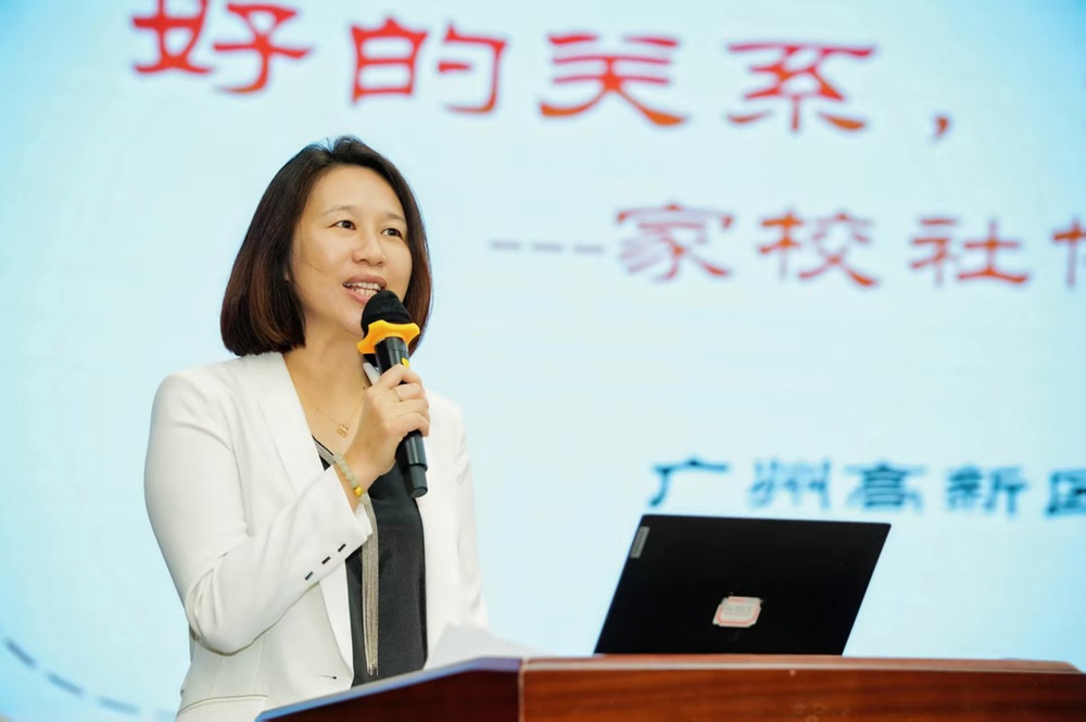 黄埔区高新一小副校长刘桦以《好的校家社关系 好的教育新生态》为题,结合该校实践案例,阐述如何构建和谐家校社关系;