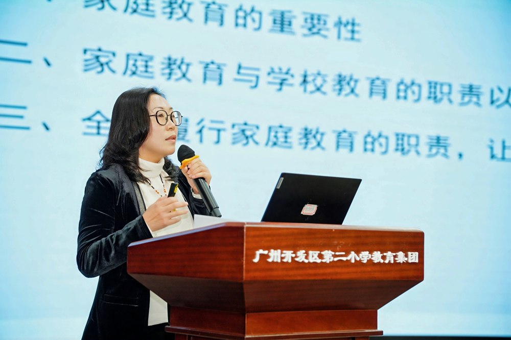 此外,国家高级家庭教育指导师张蕴翀还带来专题讲座《让家庭教育育出光芒》,为家长们提供科学育儿方法,现场互动频繁,氛围热烈。广州市教育研究院家庭教育研究室主任孔祥明作为点评专家,强调家校社共育需“目标一致、行动协同”,才能真正形成育人合力。