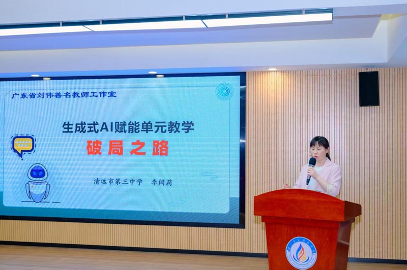 刘伟善名教师工作室成员、清远市第三中学李闫莉老师以《生成式AI赋能单元教学破局之路》为题,以“困局——破局——成效”为逻辑主线,提出“数据编码”核心方法,为一线教师提供了生成式AI落地的实操路径。她坦言:“是工作室‘问题导向+技术落地’的研修模式,让我们普通教师也能驾驭AI,真正让技术为教学服务。”