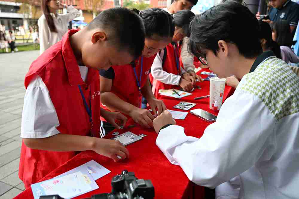 “创意拍照→拼图挑战→采访实践”,校园记者训练营的打卡环节,恰好契合了广商“重实践”的育人理念。小记者陆梓璇在姓名贴上写下名字,又在祝福墙上贴了“平平安安”——而这面墙所在的活动区,正是广商“新媒工作室”常年开展新闻策划活动的场地。陈梓淇则在拼图区收获了主持姐姐的夸奖:“这么难的拼图都能拼好,以后肯定能像咱们广商的学长学姐一样,做出好的融媒体作品!”
