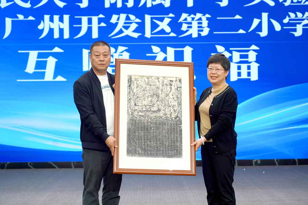 仪式上,张冬梅校长与学校党总支书记李悦新互赠纪念礼物。一幅气韵端凝的清拓秦《泰山刻石》拓片,一件草木生香的押花作品,承载着两校深厚的情谊与共育桃李的初心。
