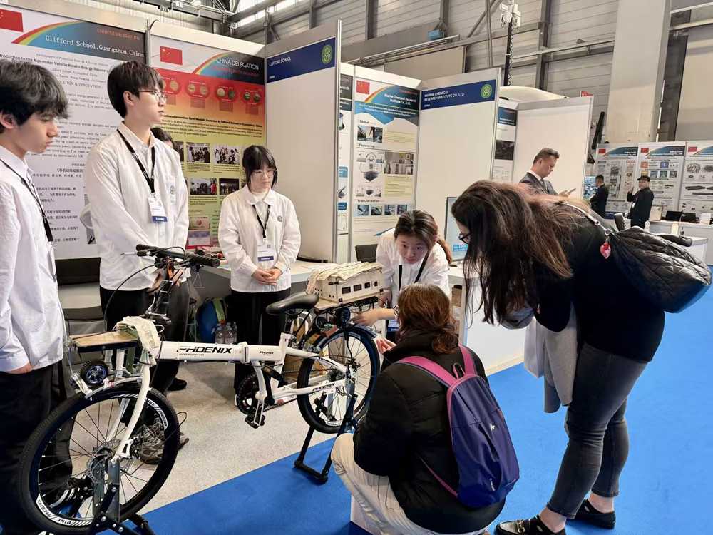 学子汤松睿与瑞士当地私立学校的创新爱好者展开深度英语交流,双向分享项目思考与设计巧思,在思维碰撞中收获新启发;学子刘涛鸣用专业且通俗的英语,为外国小朋友拆解作品核心原理,专业的表达让对方连连称赞。