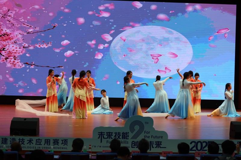 闭幕式上,城建学子为来自全国各省市的参赛师生表演了健美操《大家一起喜洋洋》与舞蹈《彩云追月·粤影流芳》,两个节目一动一静,传统与现代交织,既展现了青春活力与岭南风韵,也巧妙呼应了智能建造领域创新与融合的技术理念,充分彰显了职业教育文化育人的丰富内涵。