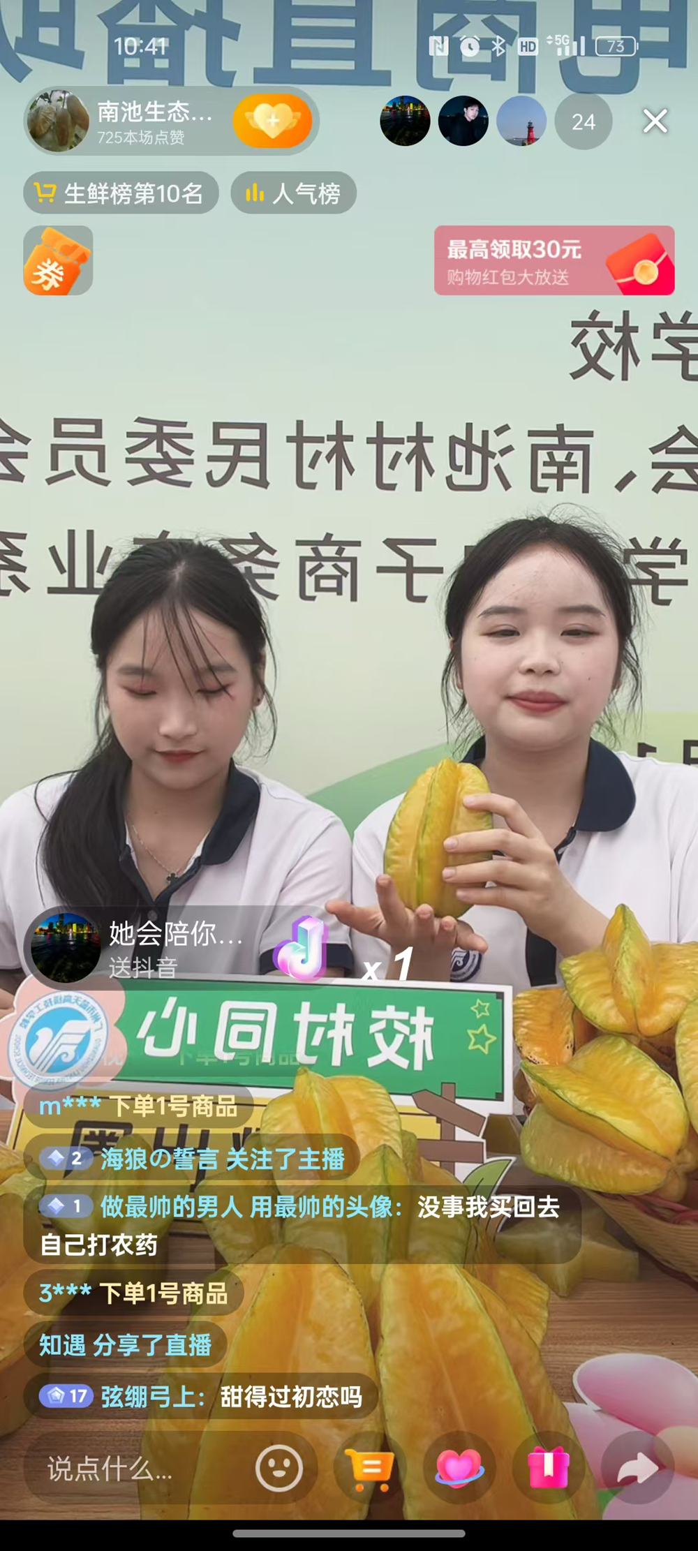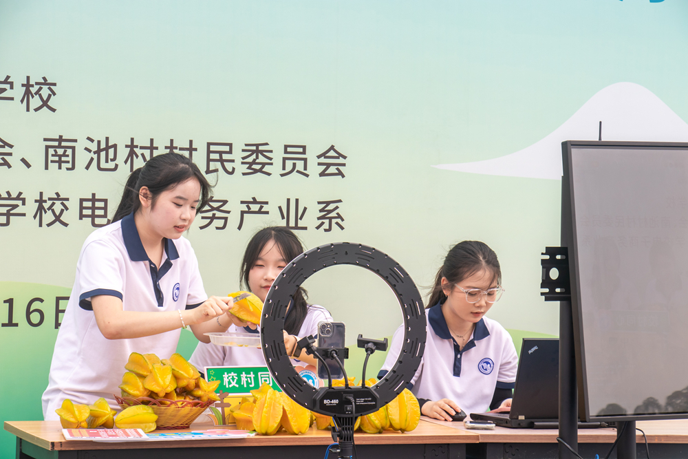 参与助农的2025级电子商务中技2班的伍晓丽同学说:“从最初面对镜头时的紧张忘词、手足无措,到后来能从容与观众互动、讲解产品;从只会机械照着脚本念稿,到能灵活解答观众关于物流、售后、口感的各类问题,每一点进步,都源于一次次的实战打磨。每当想到我们的直播能让乡亲们的辛苦付出得到回报,能让更多人了解南池杨桃,就觉得所有的熬夜备稿、反复演练都值得。原来,我们所学的专业技能,真的能成为助力乡村发展的力量!”