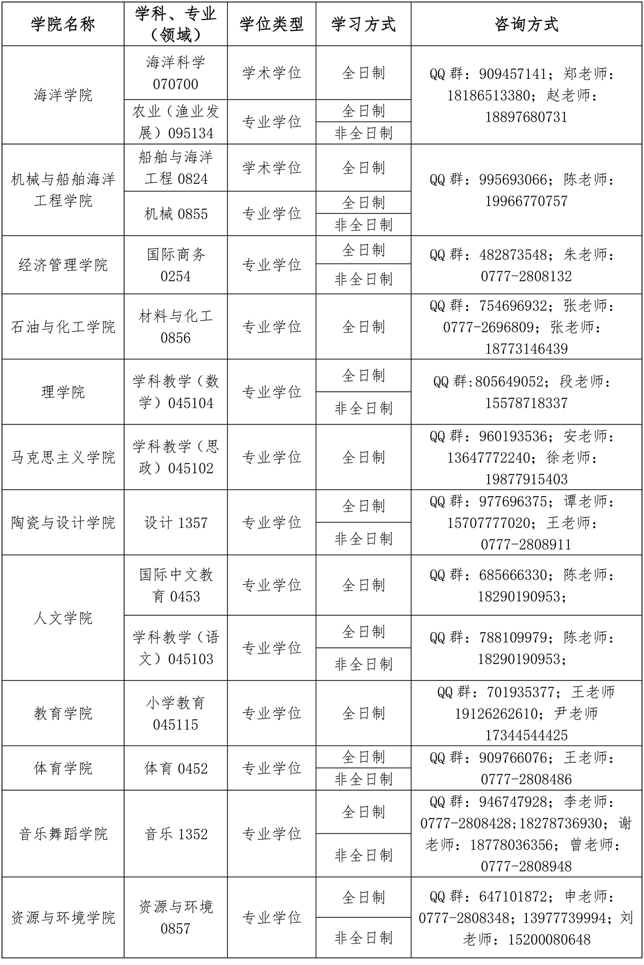 表1 北部湾大学2026年各学科专业(领域)联系方式