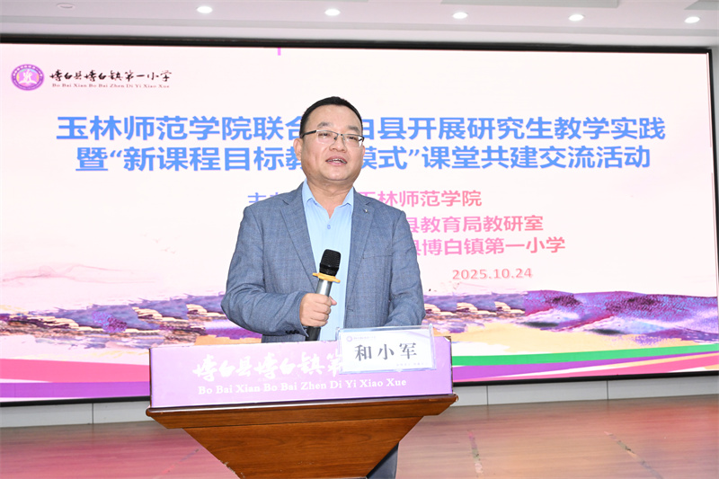 为深化高校与地方基础教育协同育人机制,助力研究生提升教育实践认知能力,同时充分展示博白县新课程目标教学实践成效,搭建教育教学成果互鉴平台,10月24日,玉林师范学院联合博白县教育局教研室,在博白县博白镇第一小学开展研究生教学实践暨“新课程目标教学模式”课堂共建交流活动。活动分为“名师示范课、专题讲座、教学经验分享交流、活动总结”等四个环节。