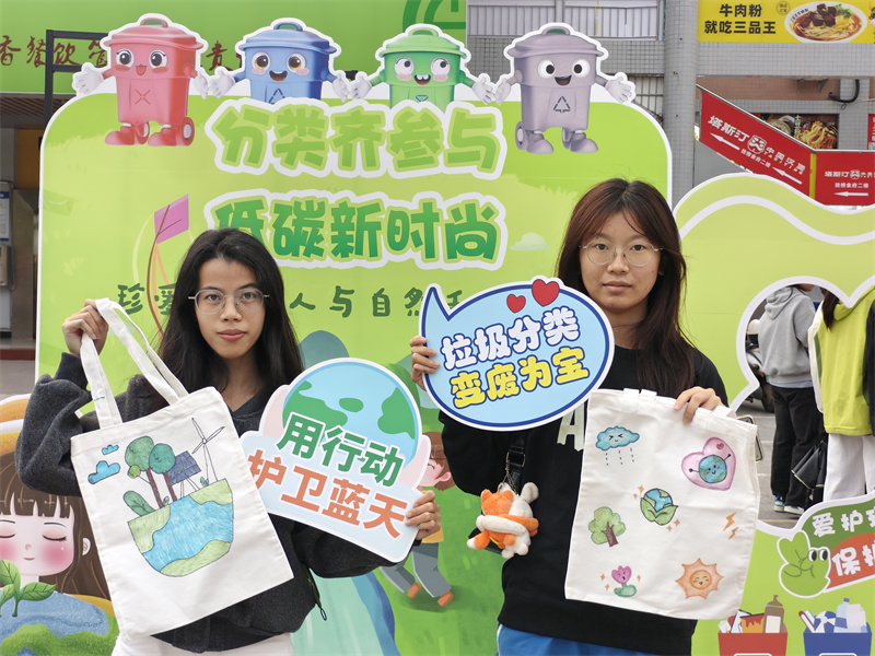 活动现场设置“分类小课堂”科普宣讲、趣味闯关、环保手工艺品展览、创意涂鸦等活动。垃圾分类讲师团学生志愿者结合四色分类垃圾桶模型和实物卡片,向师生详细讲解垃圾分类的意义、标准及校园投放指南,并指导师生操作垃圾分类智能回收设备,增强分类投放的实操能力,推动垃圾分类从认知走向实践,助力营造“人人参与、人人尽责”的绿色校园氛围。