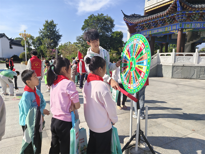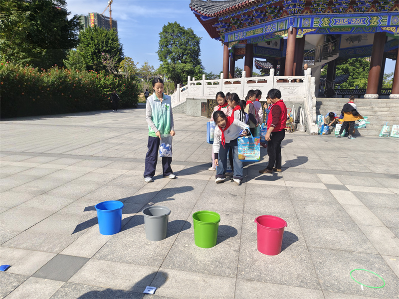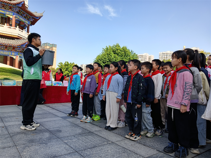 在北流市乡贤文化公园,活动面向广大市民及小学生群体持续开展。活动通过校地协同,紧密协作,将垃圾分类知识与地方文化相结合,融入圭江保护、乡村环境美化等本土元素,增强宣传的亲和力与实效性。市民和孩子们在“垃圾分类小课堂”认真听讲,在趣味游戏中学习分类技巧,在“变废为宝”展览前驻足赞叹,在涂鸦区描绘“我心中的绿色北流”。大学生志愿者还在公园周边开展清洁实践,并向市民传授分类小窍门,实现“清理—分类—讲解”一体化推进,彰显高校学子服务地方、奉献社会的责任担当。