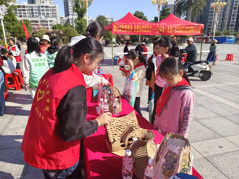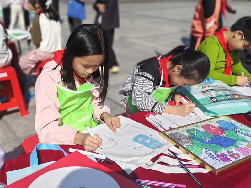 在趣味闯关区,师生踊跃参与“快问快答”“垃圾投掷”“分类速度大比拼”和“变废为宝猜猜看”等互动环节,在轻松愉快的氛围中巩固了分类知识,提升了环保意识。现场还展出由该校学生利用废旧物品制作的环保手工艺品,生动诠释“垃圾是放错地方的资源”。创意涂鸦区则成为师生表达绿色理念的舞台,一幅幅围绕“绿色校园”“环保生活”主题的绘画作品,传递出共建美丽校园的共同心愿。