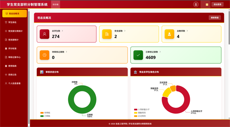 依托学院专业优势,支部组建由师生党员构成的技术攻坚小组,自主开发“学生党支部积分制管理系统”。系统支持实时申报、在线审核、动态排名与数据可视化,学生可随时查看个人积分明细与发展轨迹,增强目标导向;支委可精准掌握整体分布与趋势变化,为科学决策提供依据。依托该平台,支部年均减少纸质材料300余份,审核周期缩短50%,实现从“经验判断”向“数据驱动”转变,有效提升管理精细化水平。