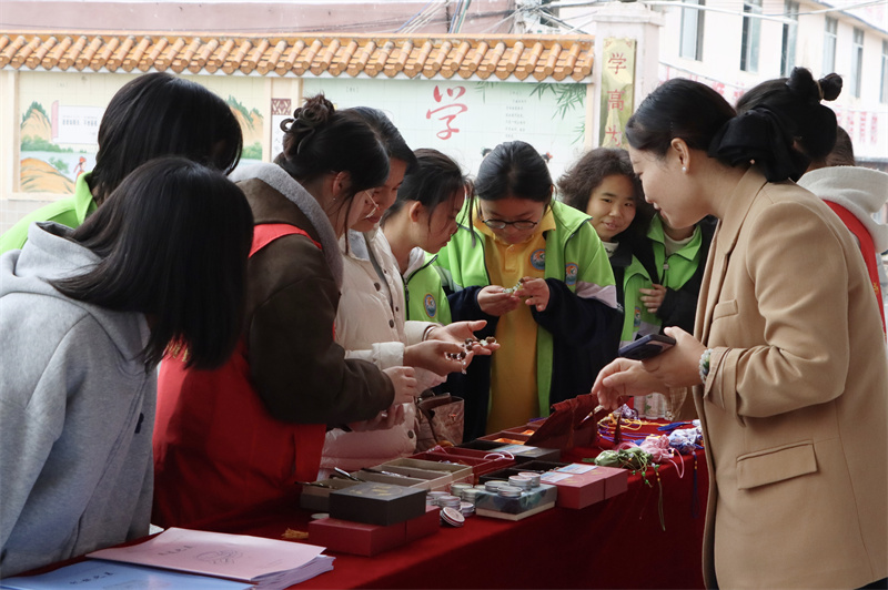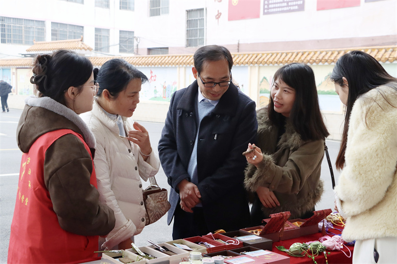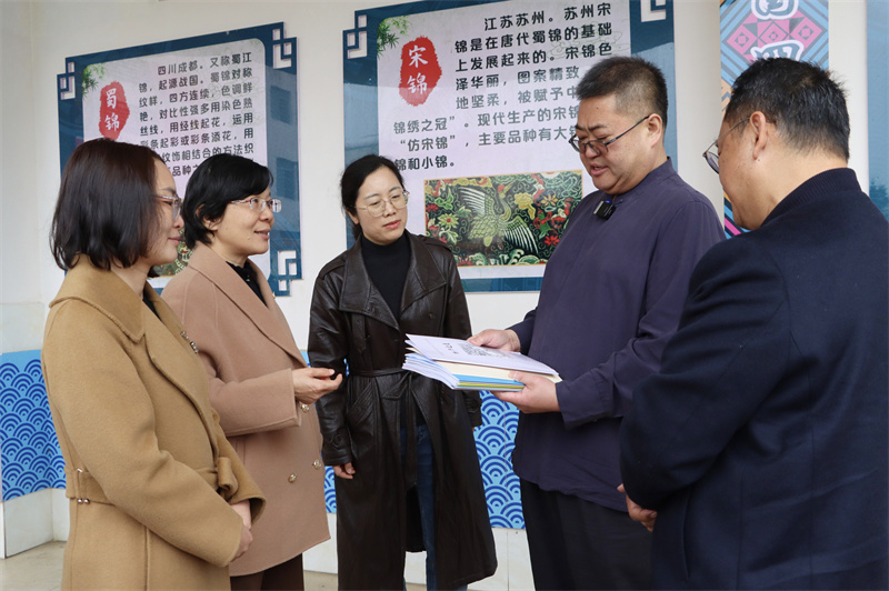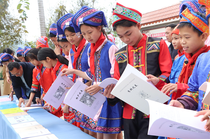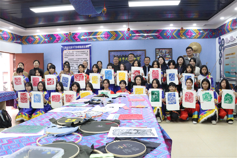 玉林市民族中学“和雅”锦绣工作坊内,中央美术学院美育研究院院长、教授宋修见开展别开生面的美育教学,为当地的孩子们带来一堂生动有趣、富有创意的美育课程。学生们在动手实践中感受乡土文化和艺术魅力,在文化体验中增强文化自信,努力让美育真正成为滋养青少年心灵、提升人文素养的有效途径。在石柜小学,两校师生与少数民族学生开展互动交流,观看学生表演的竹竿舞等民族特色节目,感受浓郁的民族文化氛围。