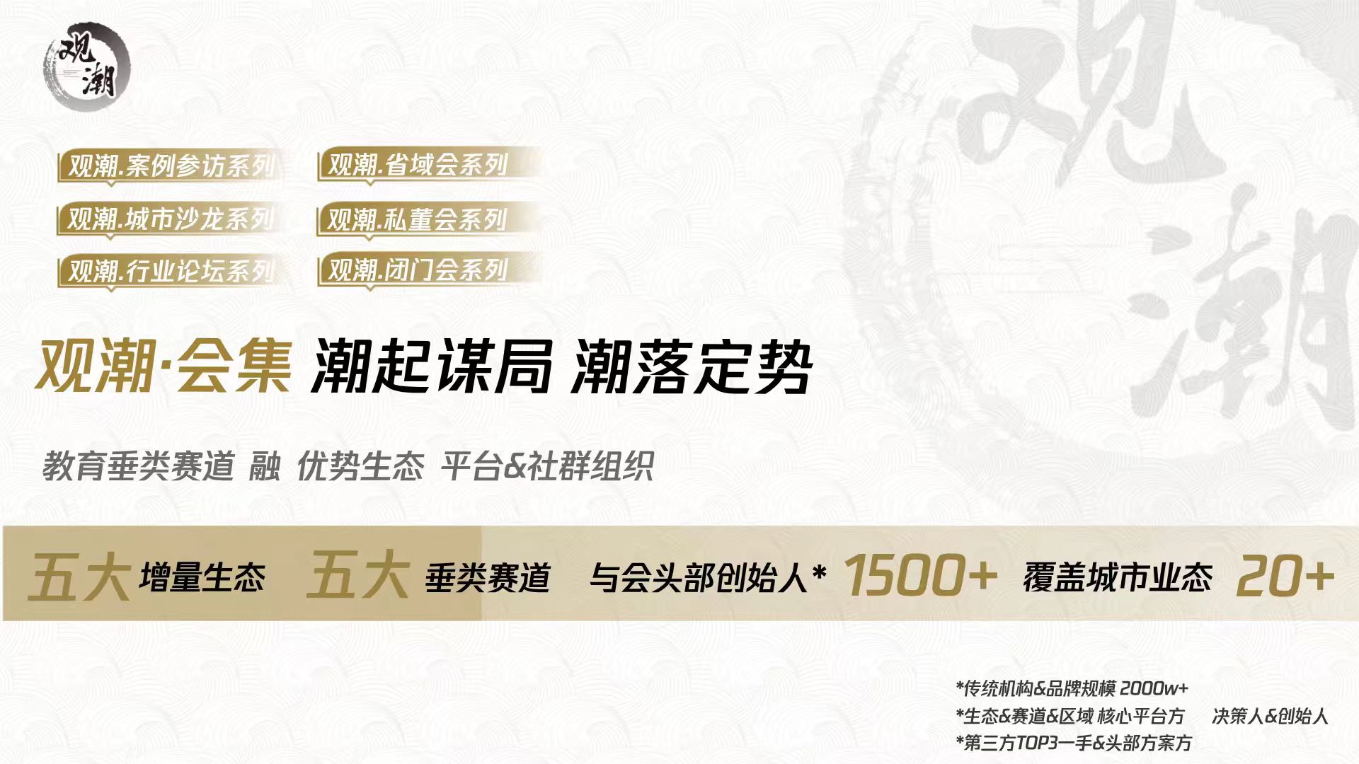 观潮会集 研判年度风向,洞察行业变化,提炼政策与需求,促成品牌机构、资本、三方服务及上下游伙伴精准对接、协同共创,形成高质量社交、资源、认知与创新闭环,加速业务协同与跨域增量价值创造。