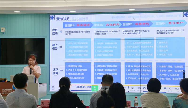 南宁市凤翔路小学韦洁玲教师带来《美丽壮乡》结项课说课。该项目从问题提出到成果产出的完整设计,清晰呈现了项目式学习“从探究到落地”的闭环流程,为在场教师优化结项课教学、完善项目评价体系提供了重要参考。