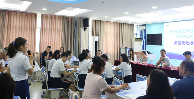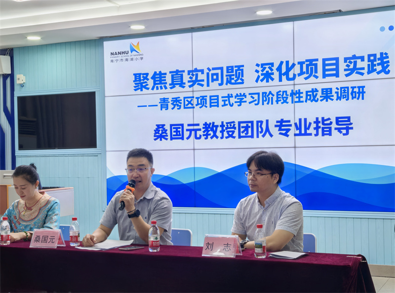 金秋十月,硕果初绽。在青秀区全力推进“基于项目式学习的教育教学质量提升”研究工作的关键阶段,10月16日,“聚焦真实问题,深化项目实践——青秀区项目式学习阶段性成果调研”活动在南宁市南湖小学举行。北京师范大学桑国元教授团队专家、青秀区教育局唐若鲁局长、黄莉学副局长入校进行指导。南宁市南湖小学、南宁市凤翔路小学的骨干教师齐聚一堂,共同见证项目式学习的实践成果,共探教育教学创新路径。