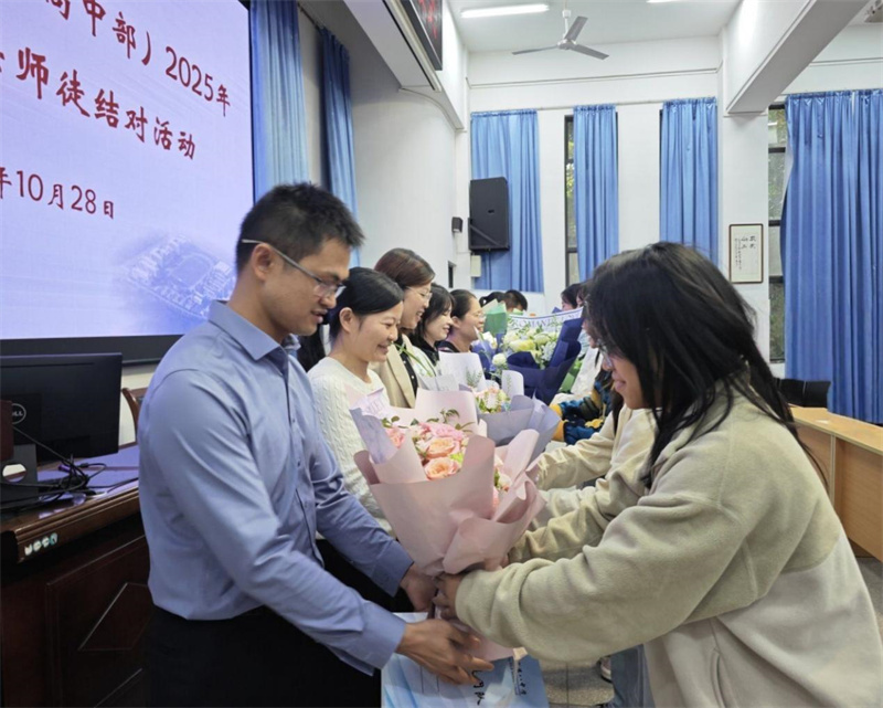 在拜师环节,徒弟们向师父献上鲜花表达敬意,师父们回赠书籍,现场氛围温馨感人。教学师父韦全勇、班主任师父黎梓君作为师父代表发言,分享教育经验并表达倾囊相授的决心;教学徒弟杨曜泽、班主任徒弟岑嘉慧作为徒弟代表表态,将虚心求教、潜心钻研。