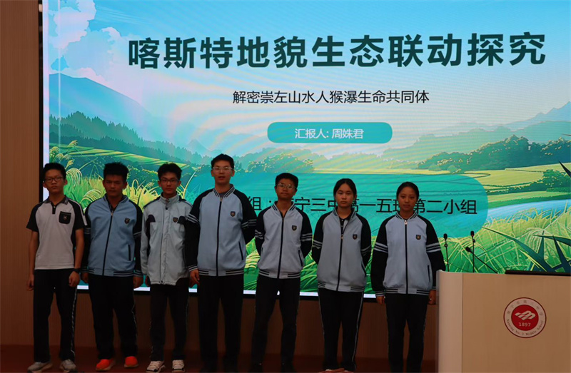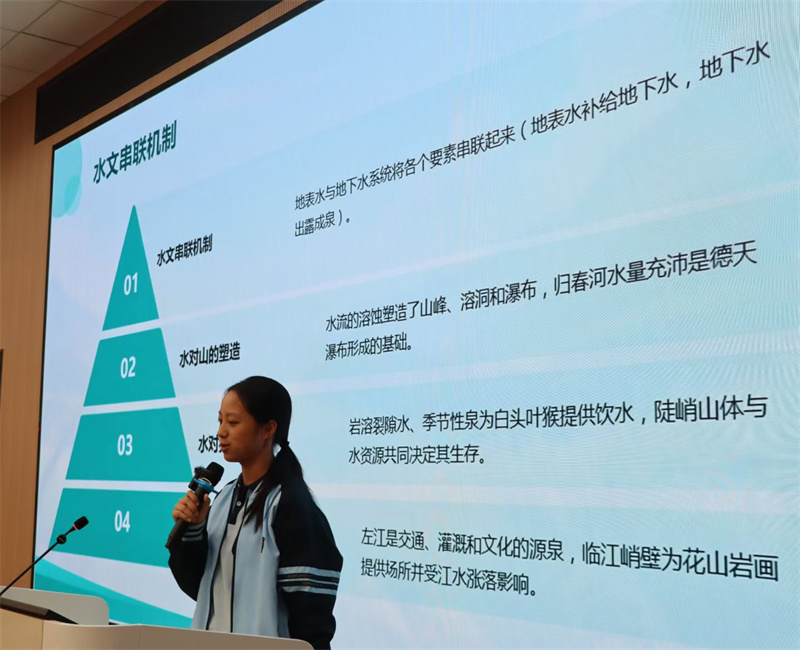 第六组“地理侦探家”则从宏观视角切入,绘制了“崇左喀斯特地貌生态关联图”。他们的研究报告系统阐释了德天瀑布、白头叶猴栖息地、花山岩画山体如何通过喀斯特水文系统相互关联,揭示了“山-水-人-猴-瀑”这一生命共同体的内在逻辑关联及其脆弱性,强调了维系该系统平衡对于区域可持续发展的重要性。