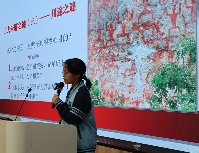 16日上午,同学们将目光投向承载着厚重历史的文化遗产。在世界文化遗产宁明花山岩画前,第二组“文明解码员”试图与两千多年前的骆越先民展开一场跨越时空的对话。他们的《花山岩画研学报告》聚焦于三大未解之谜:朱红色颜料为何能历经千年风雨而不褪色;神秘的蛙形人像、铜鼓、刀剑等图案究竟象征着何种信仰与权力;这些规模宏大的岩画是用于记录祭祀仪式还是进行天文观测?通过对比左江流域多处岩画点,小组提出,岩画的集中分布与喀斯特峭壁的避雨防风特性相关,其内容组合很可能再现了古骆越人“临水祭祀”的宏大场景。