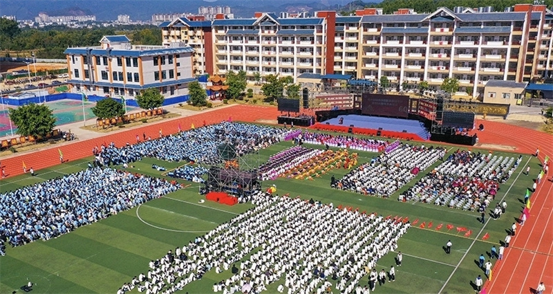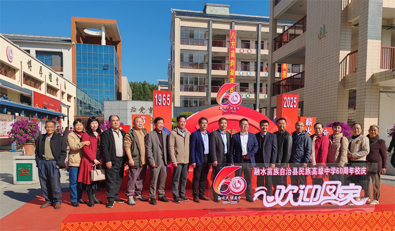 金秋送爽,硕果盈枝;苗山欢歌,桃李芬芳。2025年11月29日,融水苗族自治县民族高级中学(简称“融水民族高中”)校园内彩旗招展、笙歌飞扬,洋溢着喜庆祥和的浓厚氛围。来自五湖四海的校友、兄弟学校代表、各级领导与全校师生欢聚一堂,共同见证这所扎根苗乡的学校建校60周年的辉煌时刻。广东省廉江市、广西柳州市“组团式”帮扶学校及市属友好学校代表专程莅临道贺,县委常委、副县长袁源,副县长沙昱彤等县领导出席庆典,与四千多名师生校友共襄盛举,续写苗乡教育高质量发展与民族团结进步的崭新篇章。