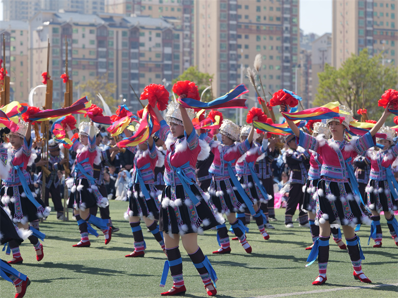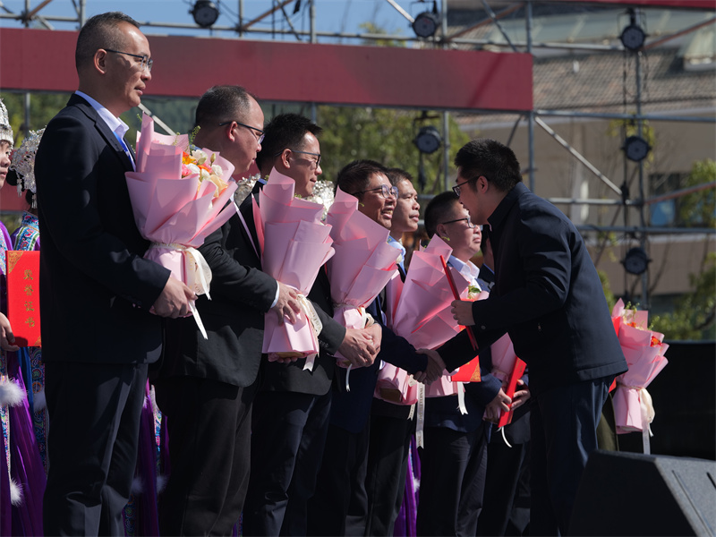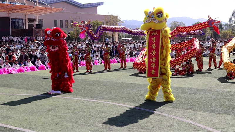 庆典现场的表彰环节温情满满、催人奋进。学校为15名任教25年以上的老教师颁发荣誉证书,感谢他们数十年如一日深耕三尺讲台、潜心立德树人的坚守与奉献;为8位历任正职书记、校长授予荣誉勋章,致敬他们为学校奠基领航、深耕民族教育的远见与付出。掌声中,初心与敬意交织,责任与使命传承,成为校庆盛典中最动人的注脚。随后的文艺展演精彩纷呈,金龙腾跃、雄狮献瑞、芦笙合奏、苗族歌舞,师生校友同台献艺,既展现了浓郁的民族风情,又抒发了对母校的祝福与热爱,歌声与欢笑声将现场气氛推向一个又一个高潮。