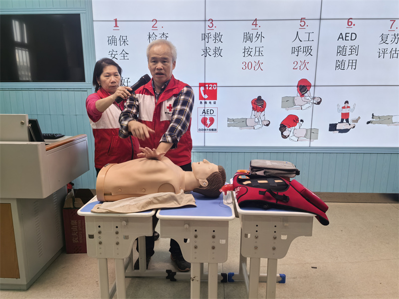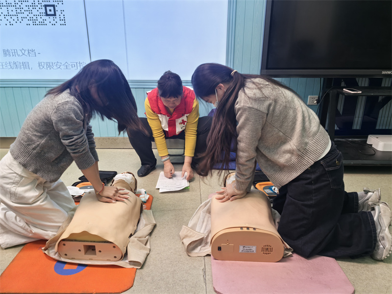培训伊始,讲师结合校园常见突发场景,通过真实案例引入急救知识,重点讲解了心肺复苏(CPR)、海姆立克急救法、自动体外除颤器(AED)使用规范等核心内容。从判断伤者意识、呼叫救援的基础流程,到胸外按压的频率(100-120次/分钟)、深度标准,再到成人与儿童急救的差异要点,讲师均进行了细致拆解,确保老师们吃透理论精髓。