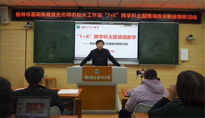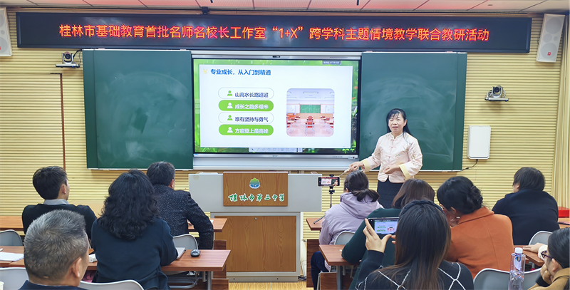 岁末冬寒聚贤才,教研深耕启新程。2026年1月15日,由桂林李品仪名师工作室主办的“1+X”跨学科主题情境教学联合教研活动在桂林市第三中学圆满落幕。来自桂林、柳州两市五县区多所学校的领导、专家及骨干教师齐聚一堂,以课例展示、专家点评、专题讲座等形式,共探跨学科教学实践路径,为基础教育创新发展注入强劲动力。