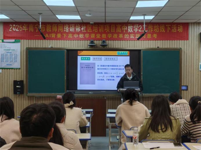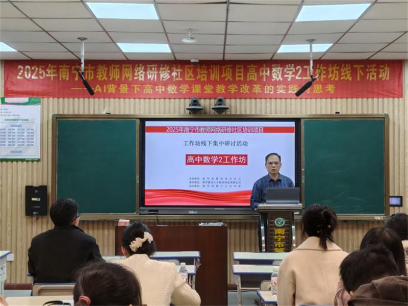 为探索AI技术与高中数学教学的深度融合,提升教师信息化教学能力,根据市师培中心要求,2025年11月27日,2025年南宁市教师网络研修社区培训项目高中数学2工作坊线下研修活动在南宁市第二十六中学顺利举行。本次活动以“AI背景下高中数学课堂教学改革的实践与思考”为主题,由高中数学2工作坊坊主江妙浩主持,特邀学科专家陈庆武老师指导,17名坊员全程参与。