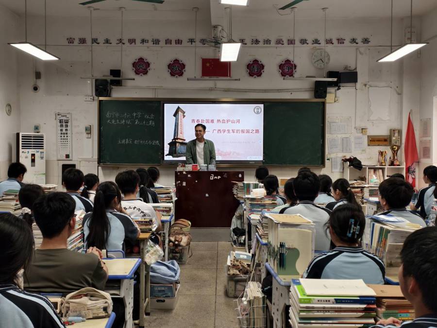 本次活动是广西区级规划课题《“四方”联建寄宿制高中生语文课外阅读指导校本课程的实践探究》课题组与南宁市“十四五”规划专项课题《家校社协同开发寄宿制高中阅读育人课程的实践探究》课题组联合开展的以“红色基因传承”为核心的系列活动之一。活动邀请南宁市人民政府地方志编纂办公室梁缘同志为高一年级学生代表作题为“青春赴国难 热血护山河——广西学生军的报国之路”的宣讲报告,将红色革命教育与理想信念教育深度融合,引导学生在历史回望中感悟初心使命,在精神传承中砥砺责任担当。