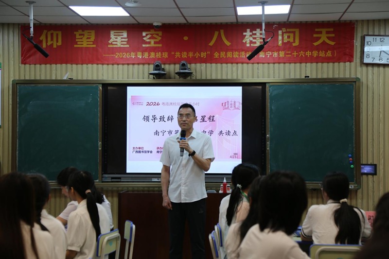4月23日上午,学校作为广西共读点之一,参与2026年粤港澳桂琼“共读半小时”全民阅读活动。我校师生代表、南宁师大实习生代表、蟠龙社区代表齐聚一堂,围绕航天主题,共读经典诗歌、科普文章及广西航天人物报道。学校党委书记沈远新宣布阅读周活动开幕,并在致辞中表示,全民阅读已上升为国家战略,读书能跨越时空、联结思想,希望以本次活动为契机,营造浓厚校园阅读氛围,勉励师生既要仰望星空、问鼎苍穹,也要静心品读、浸润书香。