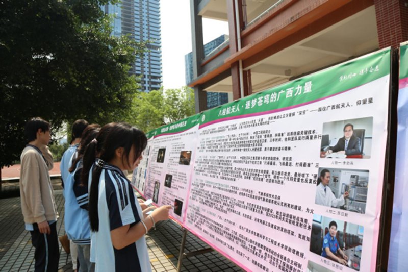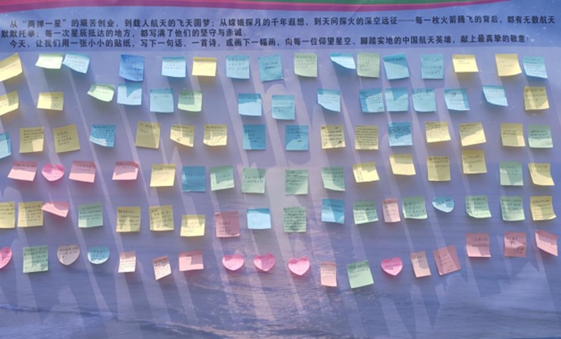 在校园升旗广场,学校设立了四大主题展板:“中国航天发展历程”“广西航天人简介”“航天作品阅读推荐”和“致敬航天人表白墙”。展板融合八桂元素与科技感,部分内容附二维码链接拓展阅读资源,方便师生扫码深入学习。特别是“表白墙”区域,师生用便利贴写下对航天人的敬意与梦想,形成了富有温度的互动空间。
