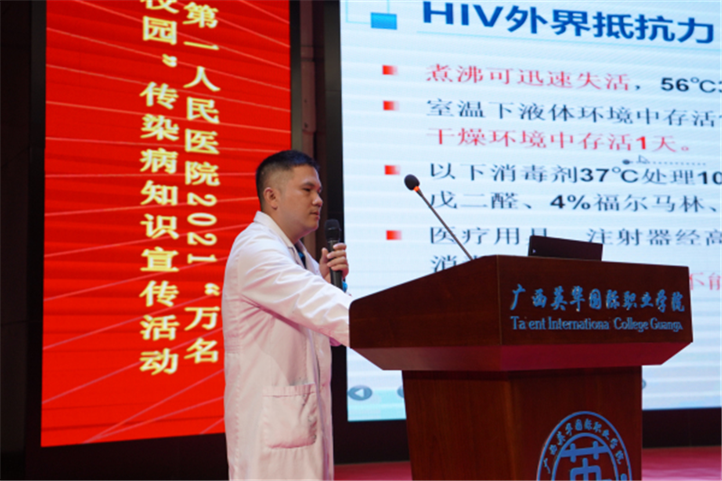 校园人口密度高,且学生正处于青春发育期机体免疫功能不健全的阶段,一旦有传染病发生,很容易在校内传播蔓延,校园传染性疾病的防治工作是学校卫生健康工作的重中之重,为提高全体师生的传染病防治意识,后勤处邀请钦州市第一人民医院感染科吴海松副主任医师到广西英华国际职业学院开展传染病知识宣传讲座。