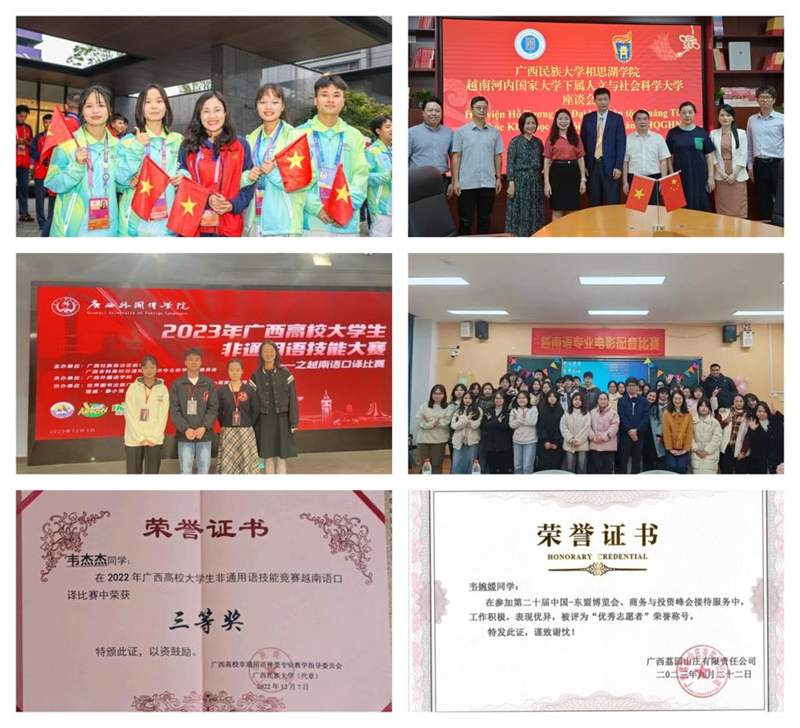 广西民族大学相思湖学院外国语言文学学院基于学校重点发展中央赋予广西的“三大定位”建设急需的应用型学科专业的办学定位,结合外语的学科特点,明确了“外语+专业+国际化”的发展目标和“双语言+双技能+国际化”特色复合应用型人才培养的定位,开设了英语、商务英语、泰语、越南语、印度尼西亚语5个本科专业。其中,越南语教研室指导学生参加全国大学生越南语演讲比赛、广西高校非通用语种技能竞赛越南语口译比赛、广西高校大学生越南语演讲比赛等各级别专业竞赛成绩突出,分别获得一等奖1项,二等奖3项,三等奖7项。同时,学院注重学生综合素质的提高,着力打造鲜明的“双语双技能”特色品牌,外语专业学生参加服务东盟博览会逾千人次,担任亚运会、雅加达印尼电子商务大会志愿者、东南亚南宁羽毛球赛翻译、G20峰会杭州萧山区城市志愿者、越南边境四省党政领导干部培训班、自治区高院的庭审翻译等高级别会议、活动,得到社会各界一致好评。