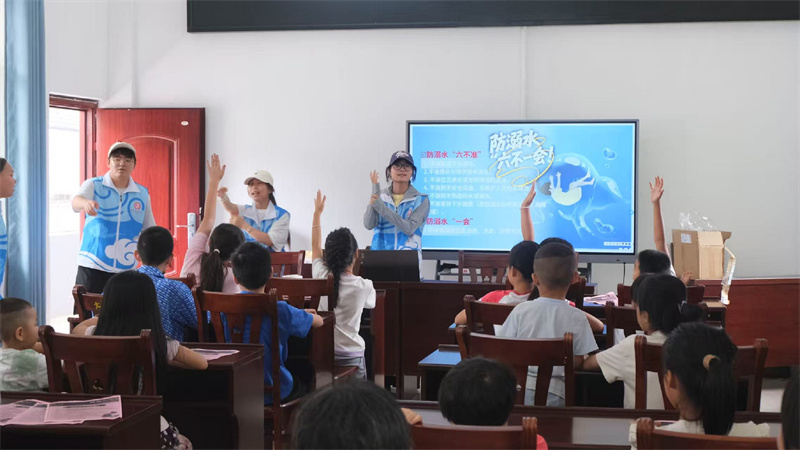 实践团成员为小朋友普及防溺水知识。覃柄栋 摄