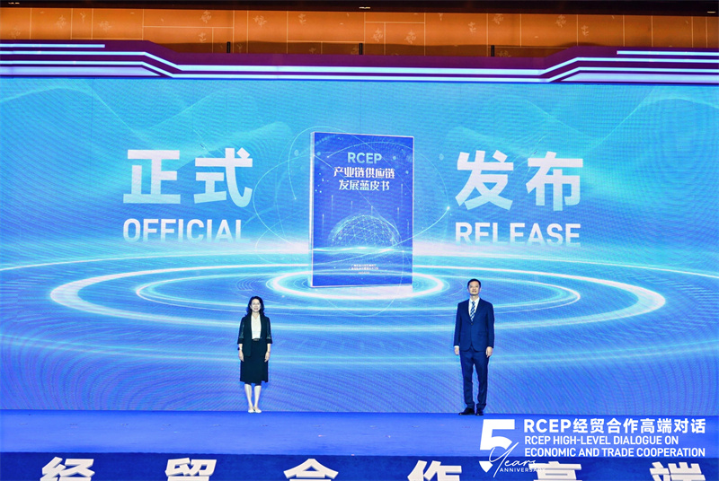 广西商务厅副厅长刘祥(右)与广西国商院校长刘杰英(左)共同发布《RCEP产业链供应链发展蓝皮书》