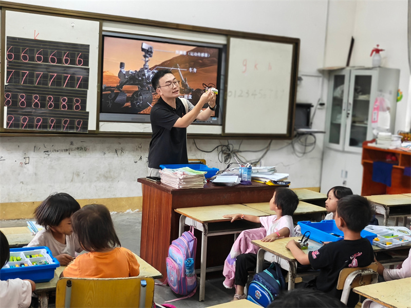 积木搭出“火星车”,编程点亮科学梦。活动中,教师党员邹源忠为瑶里村小学的同学们带来了一节精彩纷呈的人工智能体验课。他以“智能机器人——火星探险”为主题,向同学们讲解人工智能在航天领域的应用。“我们可以用积木拼出会动的火星探测器吗?”问题一出,孩子们的眼中就充满了好奇与期待。随后,在邹源忠的带领下,学生们围坐在课桌前,小手灵活地拼接起彩色积木。齿轮、传感器、马达……原本零散的零件在孩子们手中逐渐变身成了一辆辆“火星车”。